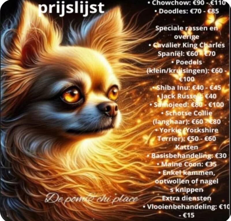 Nagels knippen bij kleine hond 5€ bij grote 10€ .Bij klanten zit dit in de trimbeurt inbegrepen .